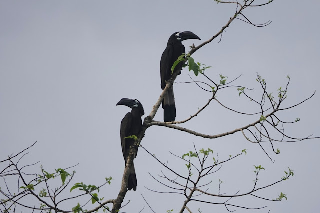 pair of Rhinoceros Hornbills then reappeared in the dead trees as we headed